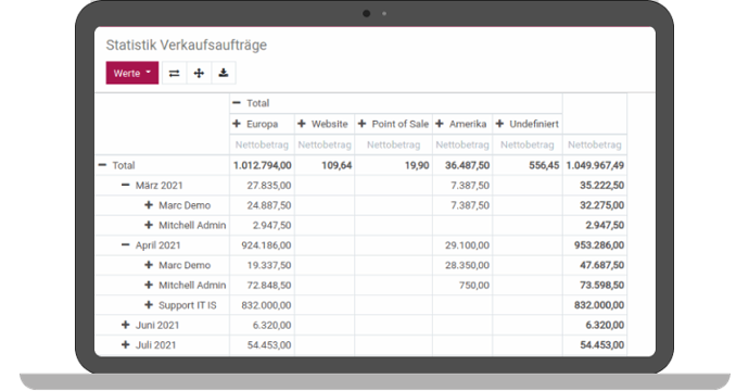 The management dashboard is complemented by the general Dashboard. Many views within ITISeasy.business are data views, known as Business Intelligence or BI views. Here, multiple data points are related and displayed in relation to each other over two axes. Whether it's sales over time, filtered or grouped by customers, or international shipment movements?