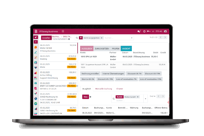 The new Reconcile feature in ITISeasy.business V18 provides a solid foundation for your accounting. With invoice reconciliation, you regularly match invoices with your bank account transactions.